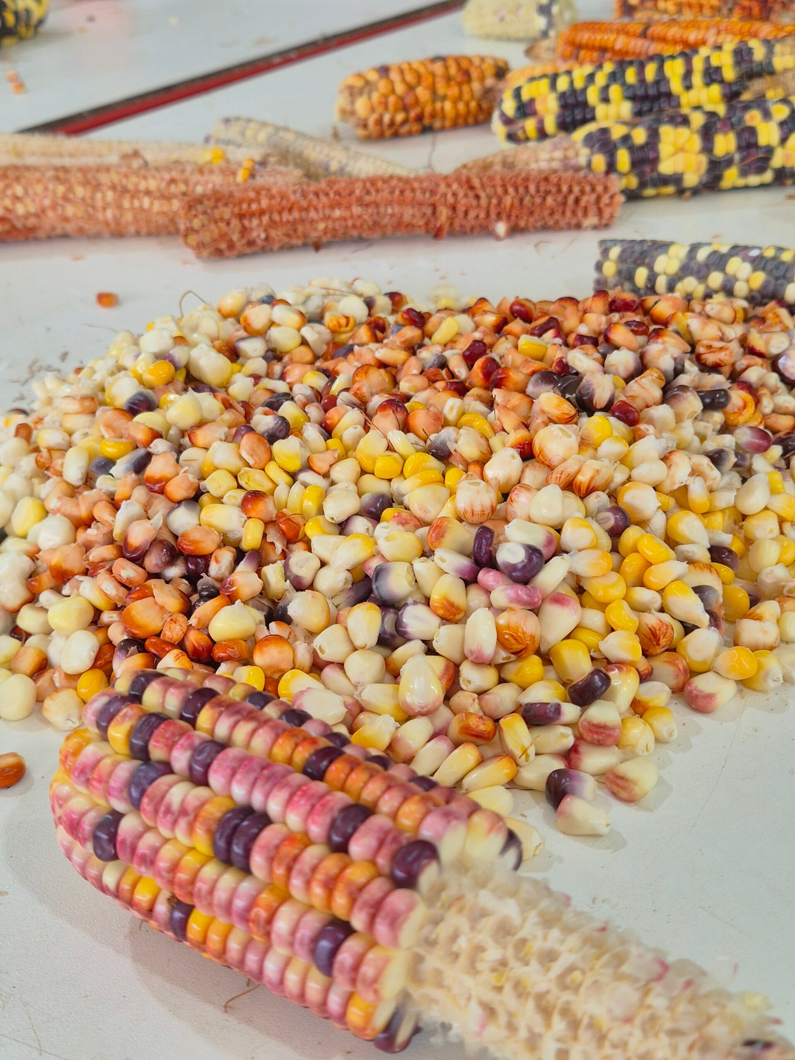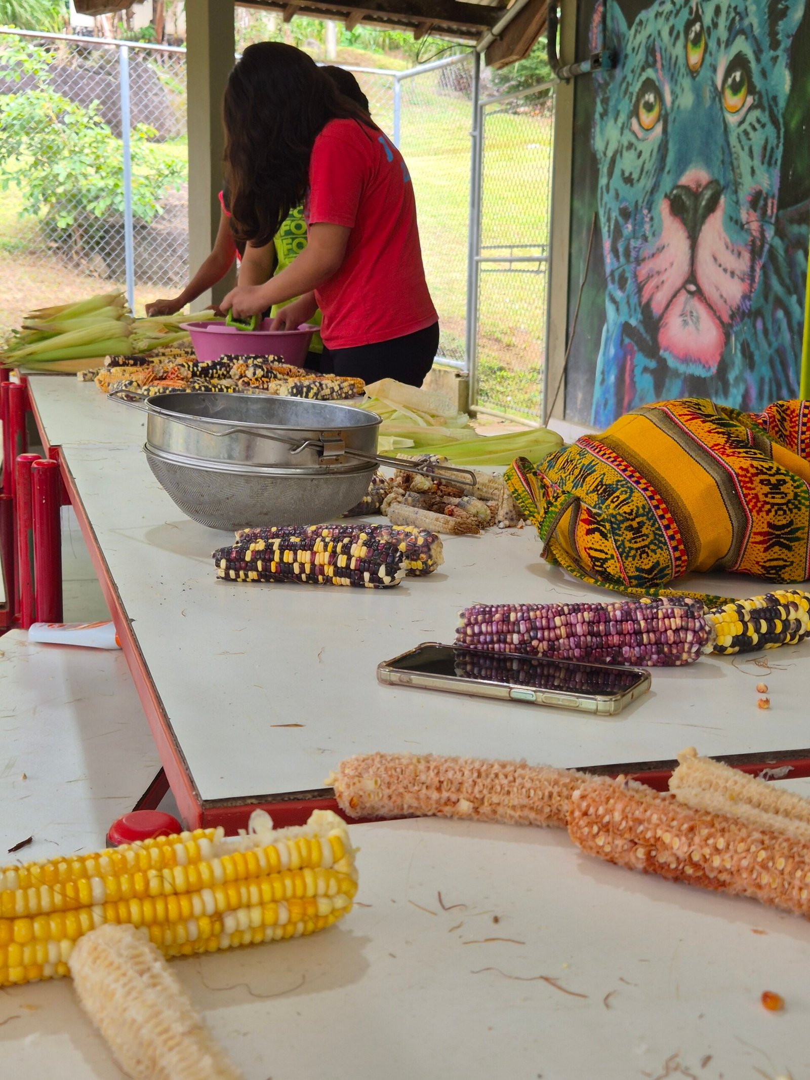 Passamos o dia cuidando do milho, debulhando, pilando, ralando e preparando os pãozinhos para assar no fogo. As crianças um pouco ajudavam, um pouco brincavam. Mas todos sempre atentos àquela beleza de cores e formas.