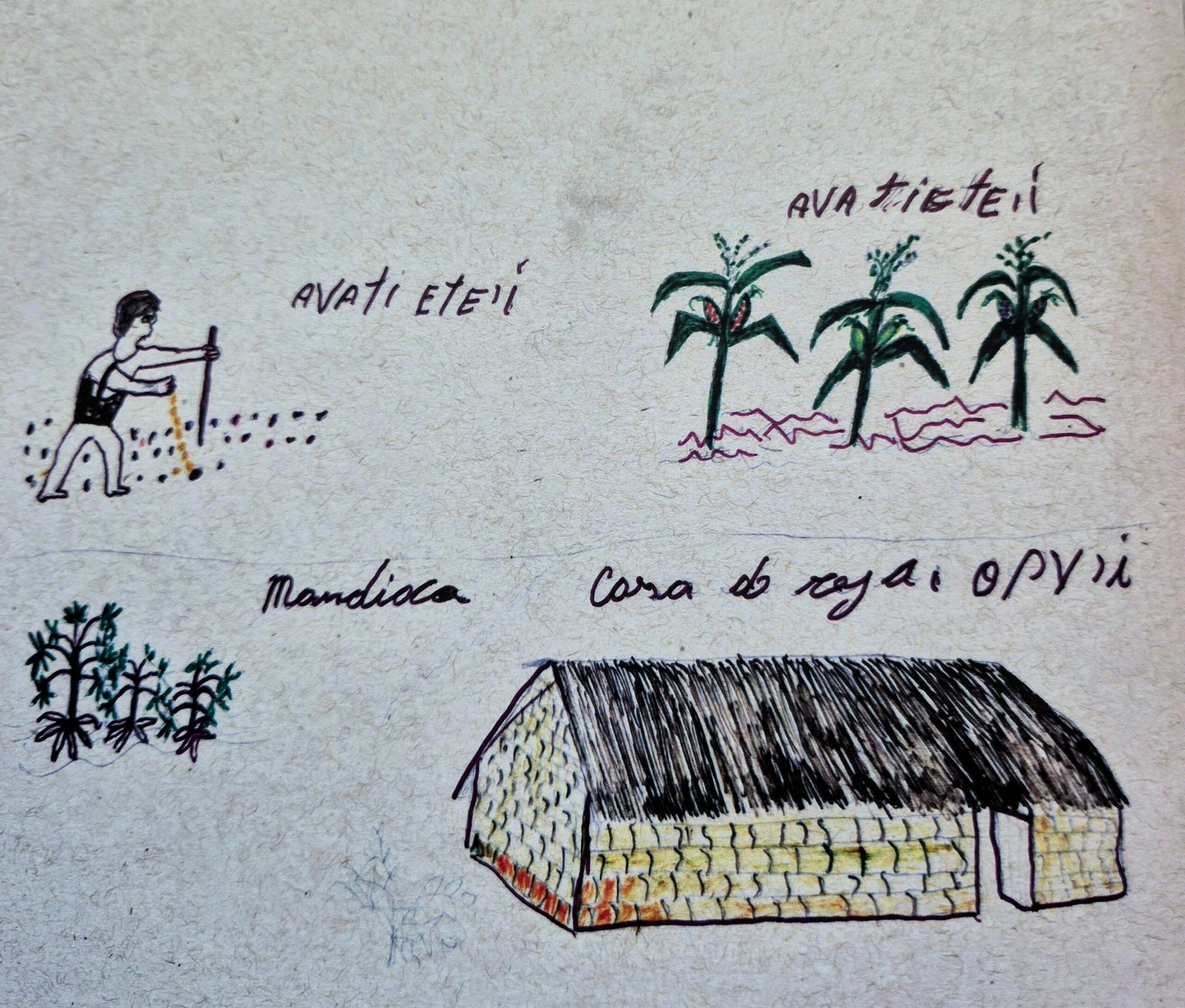 “Segundo a sabedoria Mbyá, a semeadura conecta os mundos espiritual e material, e a fertilidade do solo está relacionada à fecundidade humana. A mulher, aquela que gera a vida, foi a primeira a cultivar alimentos como o avaxi e a conhecer os cuidados necessários para sua produção. O ciclo de plantio, germinação, colheita, alimentação e replantio corresponde aos ciclos de renovação de tudo o que existe na Terra.” (Nhemongarai há’egui avaxi, Kerexu Mirim e Maria Kerexu, 2025)