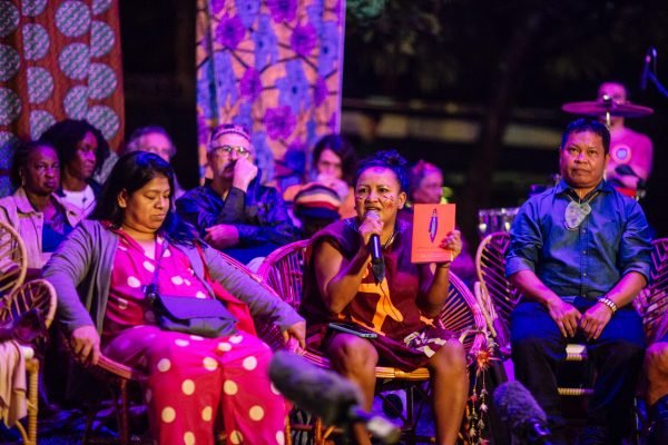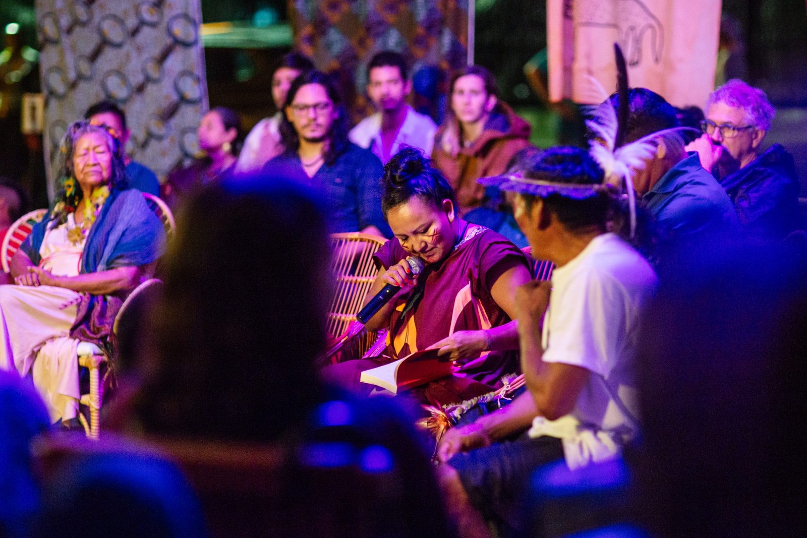 MR: A minha vontade era que a gente se juntasse agora pra fazer um peixe, fazer um almoço juntas, continuar conversando. Mas vamos ter que liberar a sala daqui a pouquinho, mesmo tendo muitas perguntas ainda. Eu tenho uma curiosidade de saber da sua aproximação com o Selvagem, como isso tem movimentado também questões no território. Seria bacana a gente saber um pouco dessa história do contato com a Dantes, a casa editorial que acolheu o seu livro, que teve essa honra.