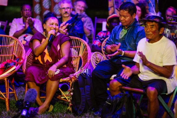 Francy Baniwa, André Baniwa e Francisco Fontes Baniwa no lançamento de ‘Umbigo do Mundo’ na Vigília da Oralidade no Museu Nacional – RJ – 15 de abril de 2023 | Fotos: Juliana Chalita – Acervo Selvagem Ciclo de Estudos