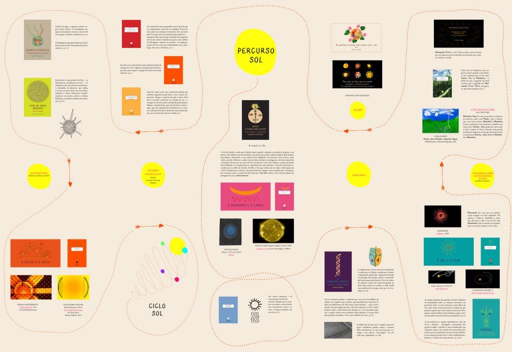 O Sol gera movimento, mas ele próprio também se movimenta no cosmos, junto aos planetas em seu entorno, traçando geometrias invisíveis aos nossos olhos. Flores que se desdobram no espaço além da nossa atmosfera, em velocidades inimagináveis. Uma dança. Também pelo nome de Nhamandu atende o Sol. Nhamandu apareceu na noite originária, desdobrando-se como uma flor que todos os dias saúda a vida na Terra, e para onde se voltam os cantos de rezadores e rezadoras. Junto à dança, o canto. A palavra que se volta para a fonte de toda a vida.