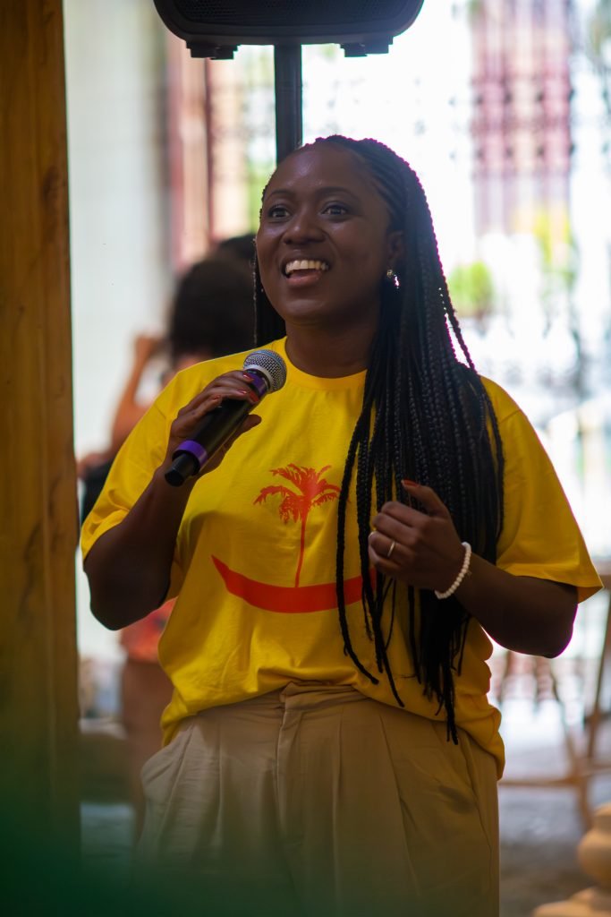 Leda fez uma longa fala, costurando muitos pontos da visita guiada: as falas de Anna e Cris, as narrativas compartilhadas por seu Francisco, e ainda as relações entre os saberes indígenas e os saberes negros, afrodiaspóricos, a partir da oralidade, do canto, do corpo, da memória.