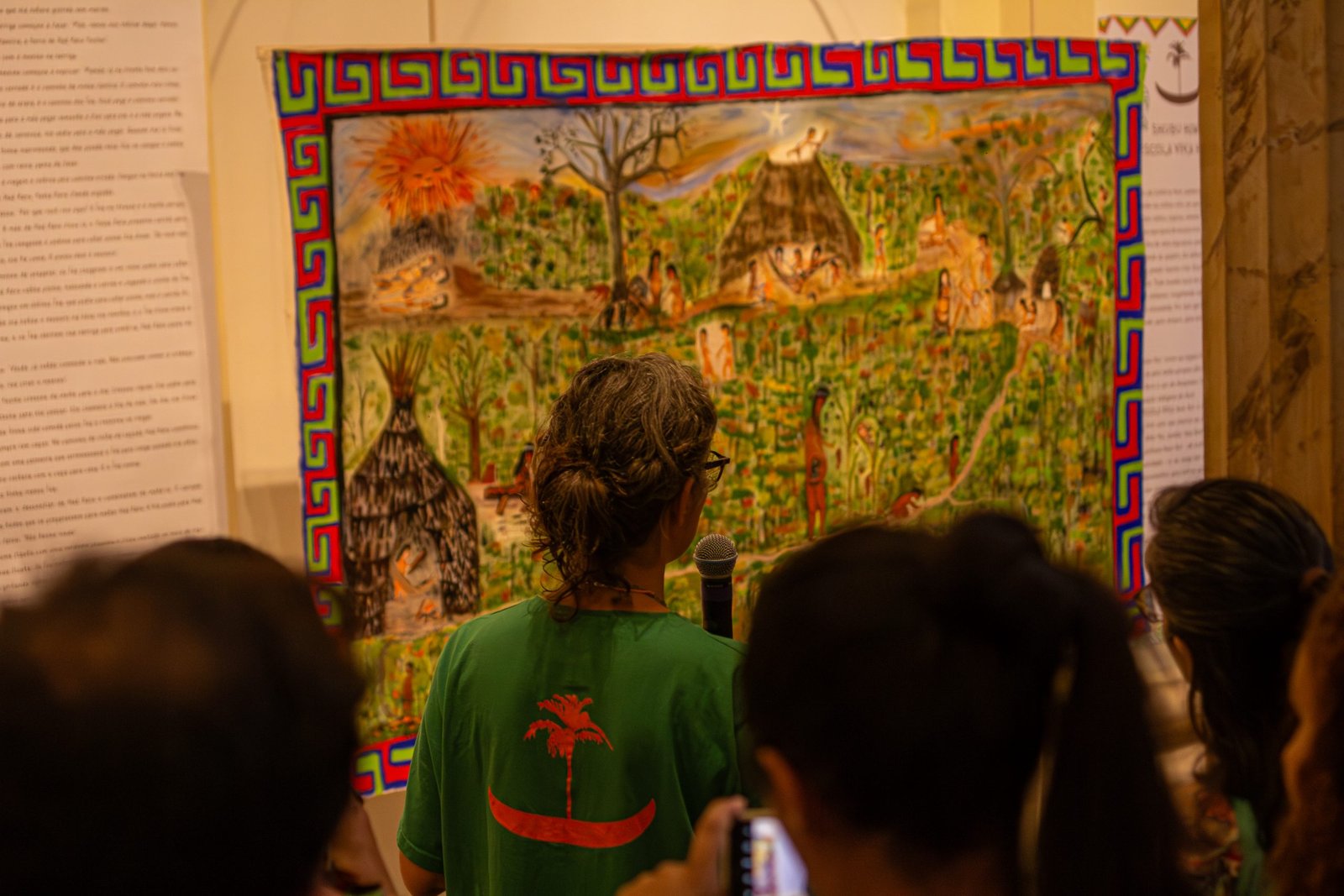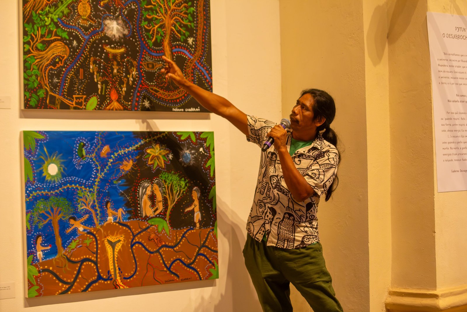 Em seguida, Cris e Carlos Papá apresentaram ao público as obras do povo Guarani, representando a Nhë’ery – a floresta que conhecemos como Mata Atlântica –, a criação do mundo e dos astros. Papá também apresentou duas telas pintadas por ele, que retratam Nhandexy – nossa mãe, o escuro – e contam a história do Sol na Terra.