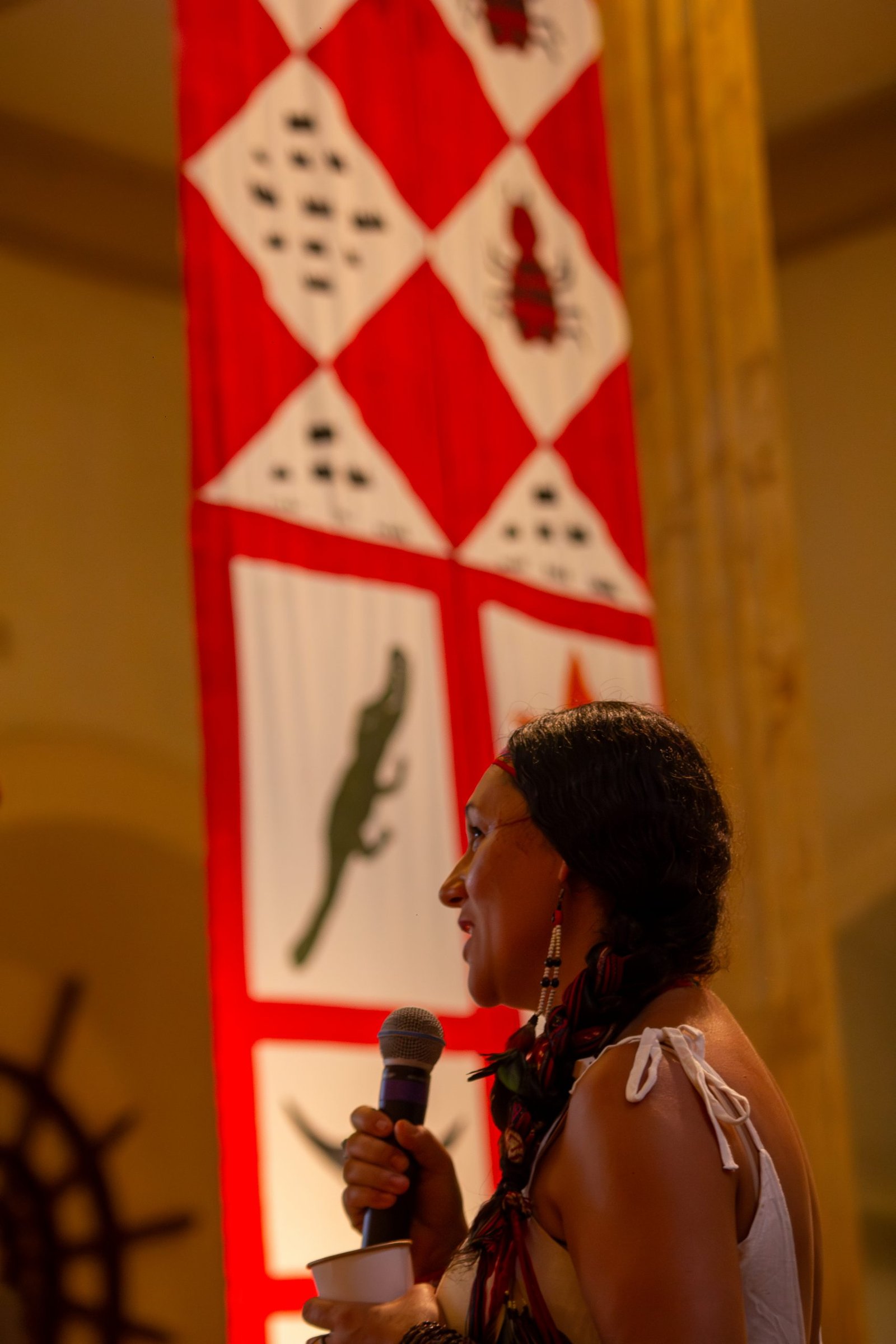Seguindo o circuito da exposição, Cris Takuá falou sobre as grandes bandeiras Guarani e Maxakali e a importância dos elementos culturais e espirituais ali presentes. A bandeira Guarani, por exemplo, traz uma representação de um petyngua (cachimbo), que é usado para o tabaco e as rezas. Cris ressaltou esse elemento e como o povo Guarani acredita e sustenta que o tabaco – natural, usado segundo as práticas ancestrais e sagradas – traz muitas curas, diferente do uso que a sociedade não indígena fez dele.