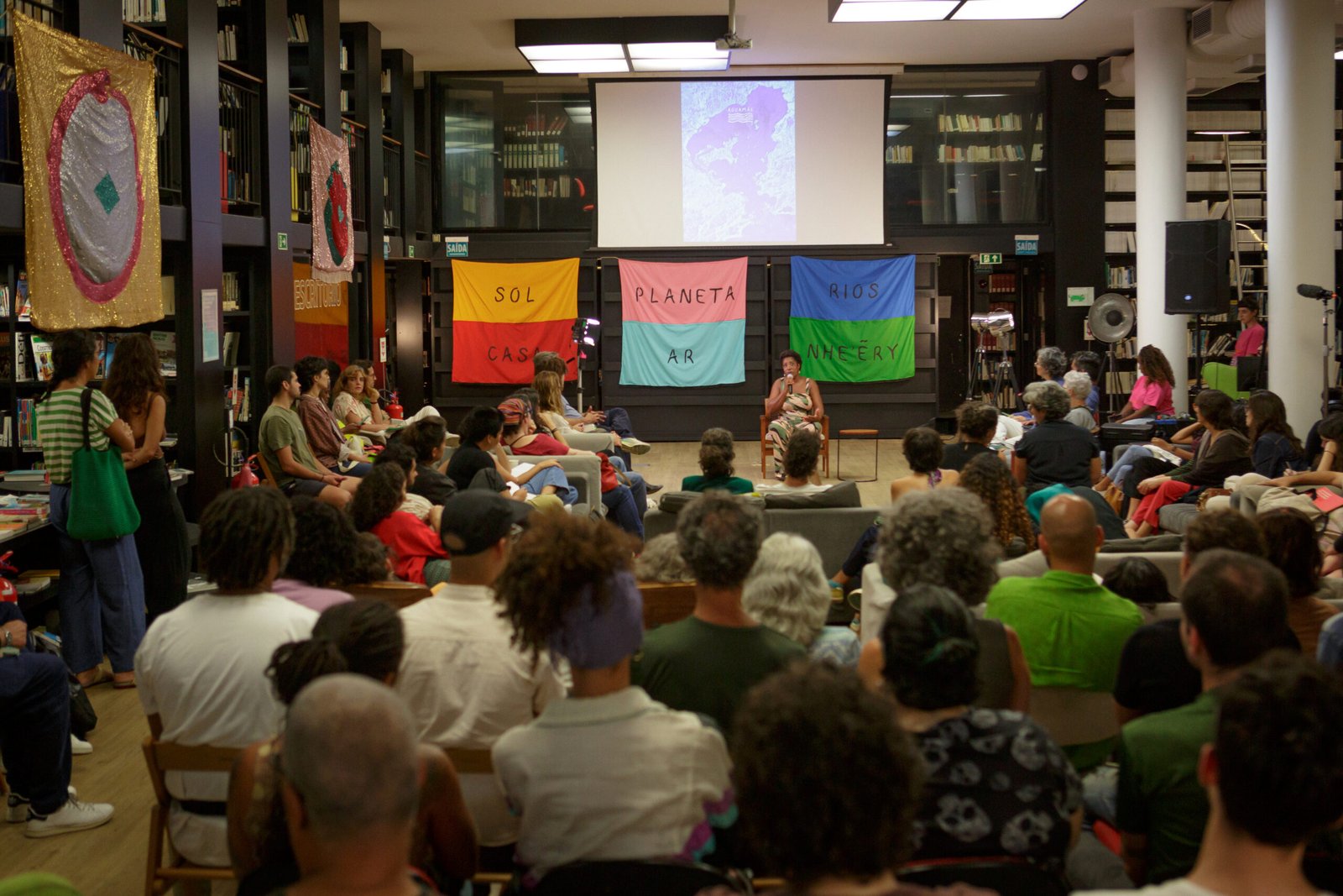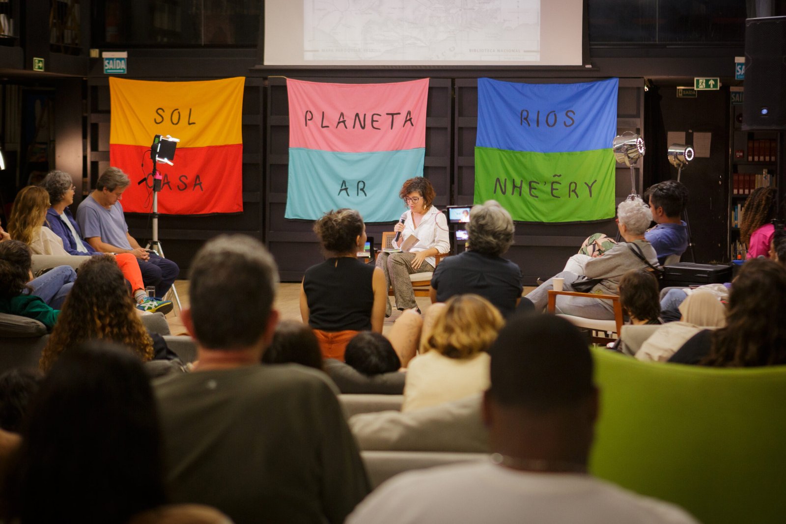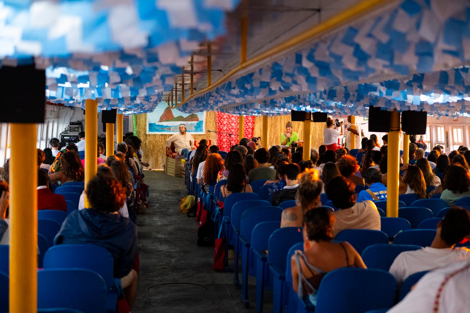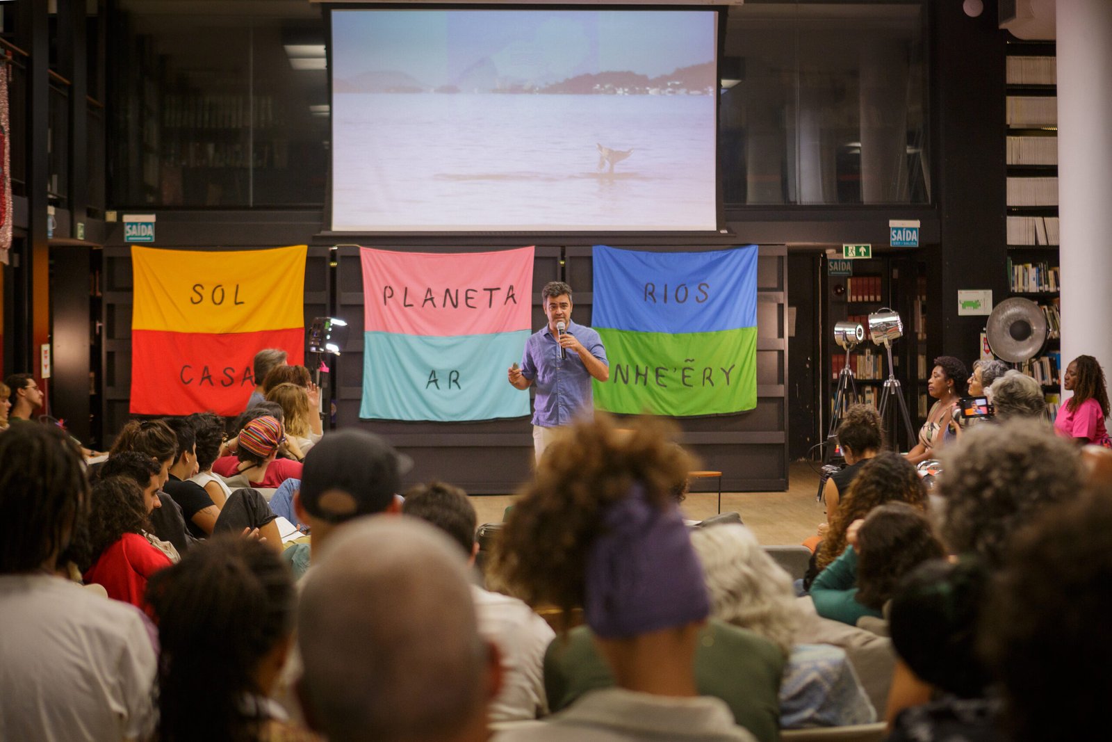 Engineer and geologist Nuria Fernandezspoke about facoidal gneiss, “the most Carioca of rocks,” which places us, through the stones of Guanabara Bay, in dialogue with the deep layers of this territory’s origins. Carlos Papá, coordinator of the Guarani Living School, shared part of his profound research that connects language, territory, and protection: “Guanabara has another translation in Guarani, Kua-Gua-Mba-Ara, something like ‘embrace every day’.”