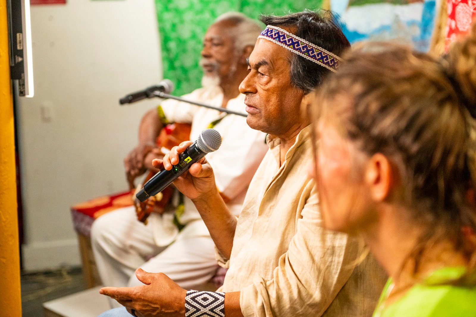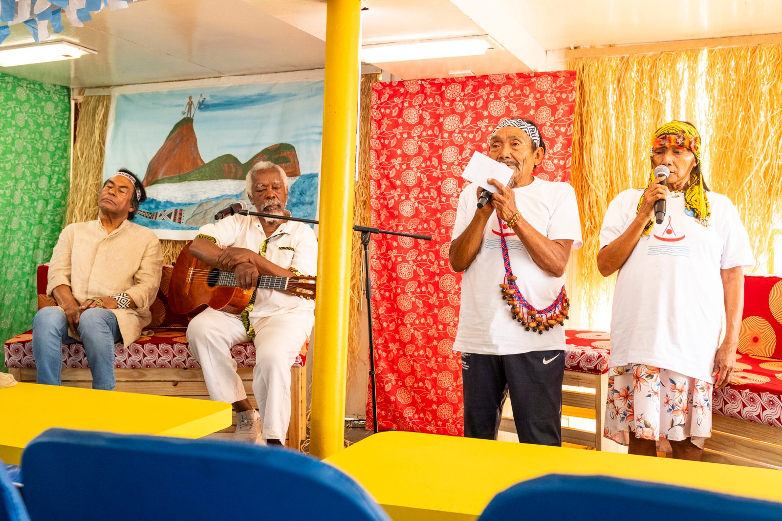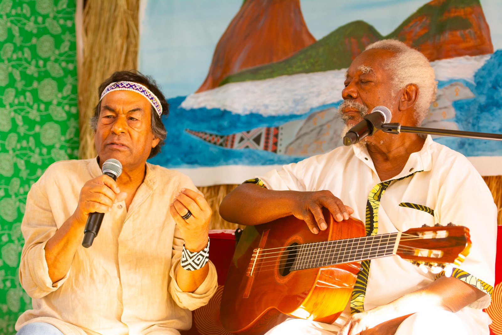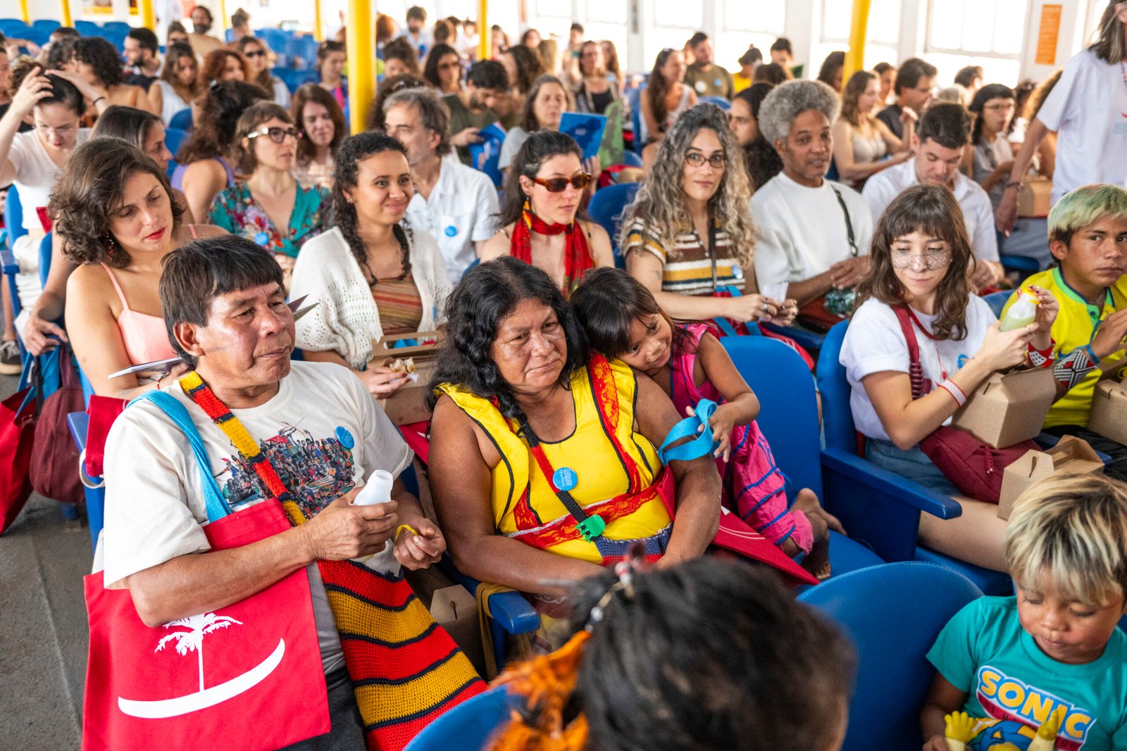 During the journey, the enchantment also unfolded in Indigenous songs from different regions of Brazil, such as those of Huni Kuin pajé Dua Busë and Netë, from the Heart of the Forest Village, the Huni Kuin Living School in the Upper Jordão River region (Acre); and those of artist and pajé Mamei Maxakali alongside Sueli, Isael and Isabelinha Maxakali, from the Forest School Village, the Maxakali Living School, located in the rural area of Teófilo Otoni (Minas Gerais). The japurutu flutes were played by Francisco Fontes Baniwa and Idjahure Kadiwel, representing the Baniwa Living School, located in Assunção do Içana (Amazonas).