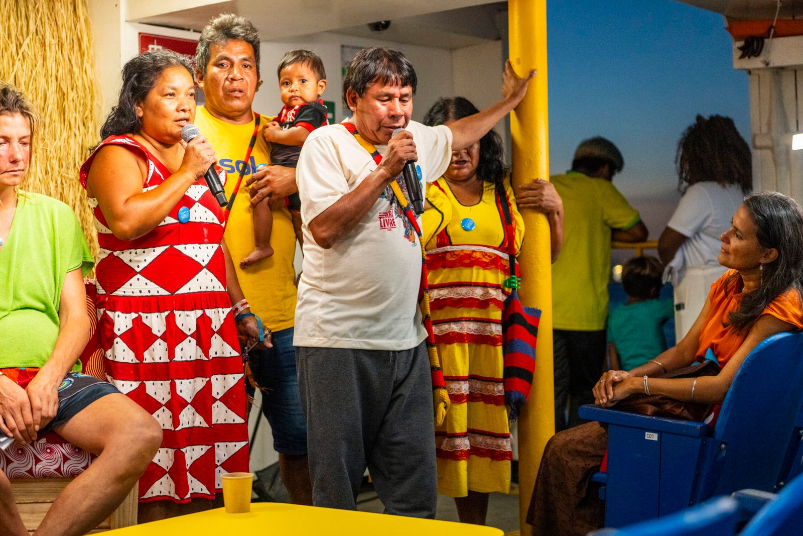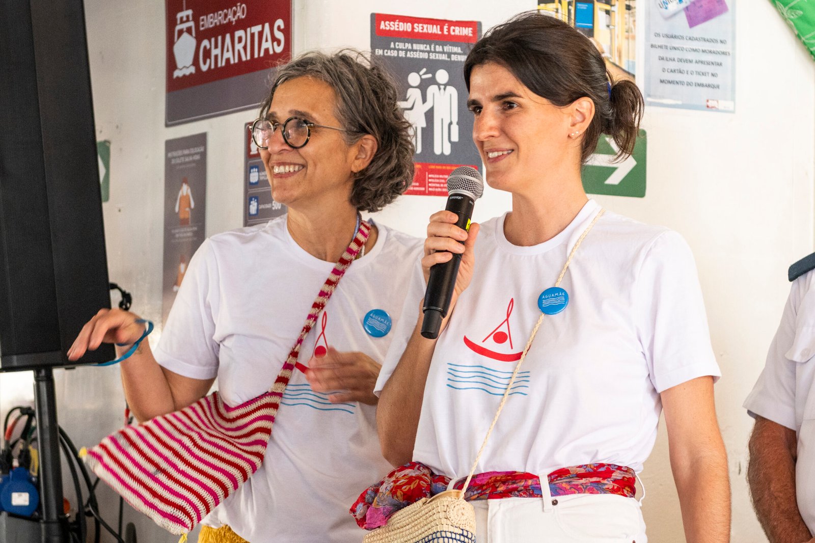 Ailton Krenak, Indigenous leader and co-founder of Selvagem, was joined by the musician and thinker Mateus Aleluia, bringing their visions together during the journey, which in Ailton’s words becomes a “gesture that claims the historical memory of this territory". Mateus Aleluia brought the enchantment of the waters through his songs during the crossing, while also questioning colonial narratives and reclaiming the ancestry of African-origin spiritual traditions: “All culture comes from a cult. Life itself is a cult – a religare. And only in 1978 were Black people allowed to practice their cult without needing to ask for permission".