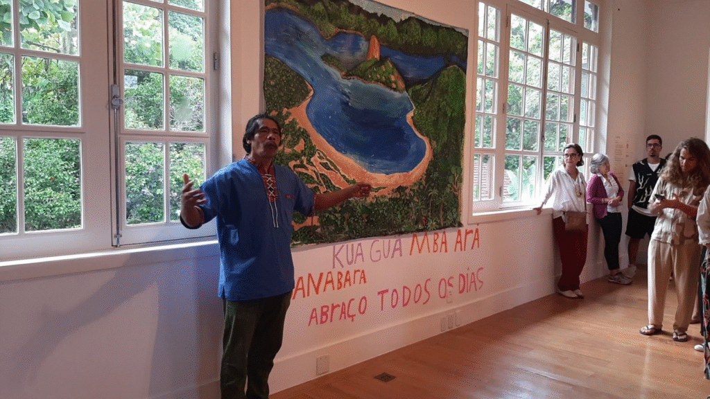 Carlos Papá, coordenador da Escola Viva Guarani, apresentou um pouco dos saberes e da filosofia presentes na língua Guarani. A exposição Mba’é Ka’á conta com uma pintura inédita dos artistas do Ponto de Cultura Mbya Arandu Porã, que retrata a Baía de Guanabara, no Rio de Janeiro.
