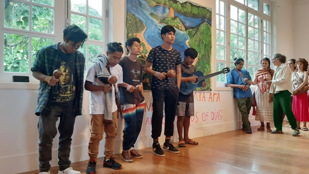 Os jovens artistas Guarani que criaram as obras junto a Papá também estiveram presentes na exposição. Fabiano Kuaray Papa, Alexandre Wera, Bruno Djeguaká, Leonardo Karai Rokadju e Alex Karai fizeram cantos e rezas para encerrar o encontro, saudando Nhanderu, o criador, e a floresta.
