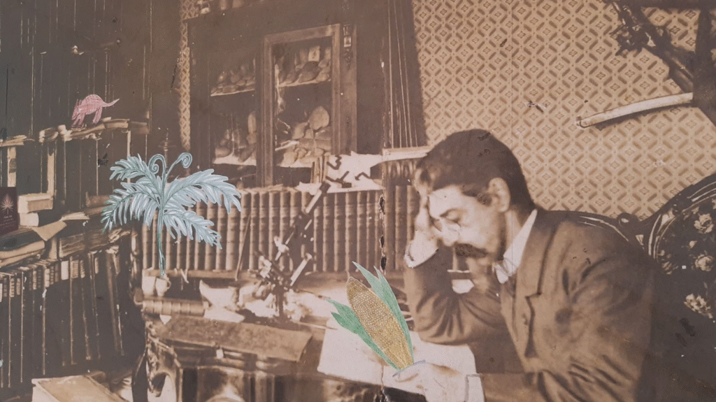 João Barbosa Rodrigues em seu gabinete, em 1903, envolvido por desenhos feitos por jovens da Terra Indígena Jaraguá em 2018, para a edição do livro “Mba’é Ka’á: o que tem na mata – a botânica nomenclatura indígena”, pela Dantes Editora.
