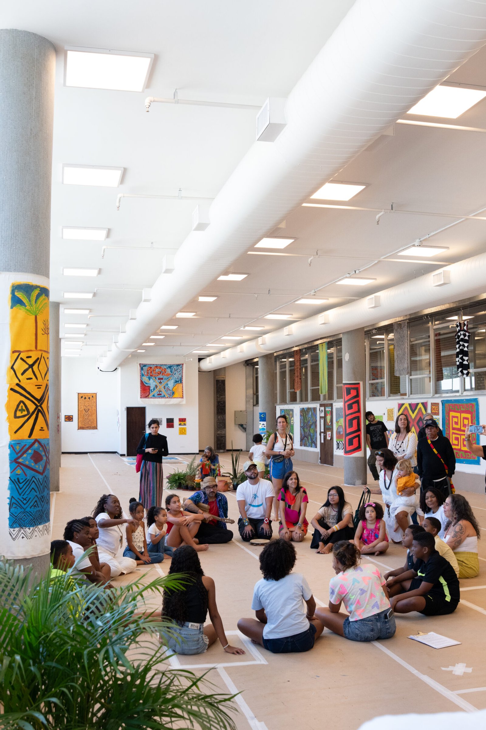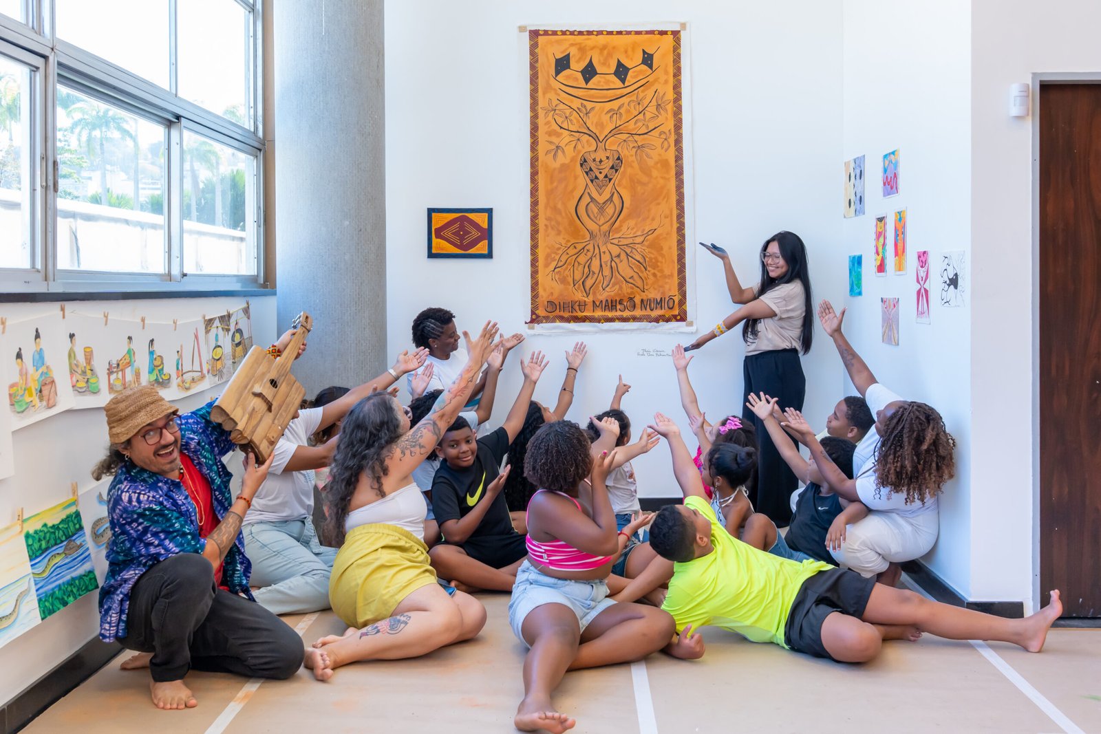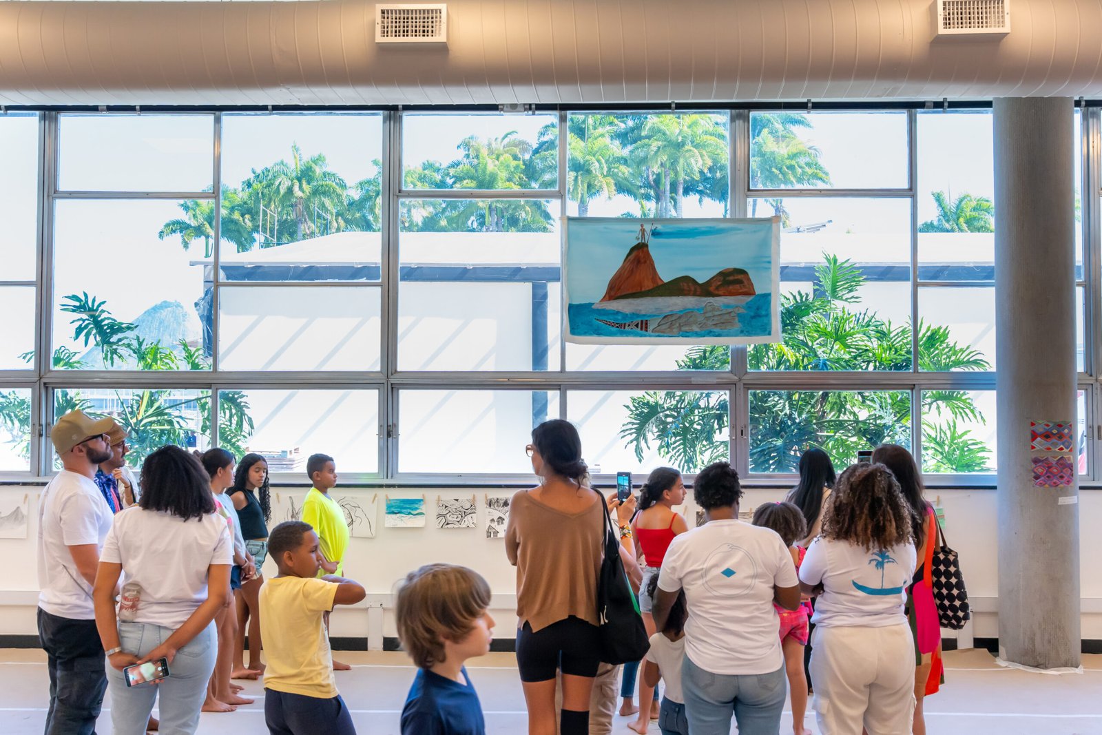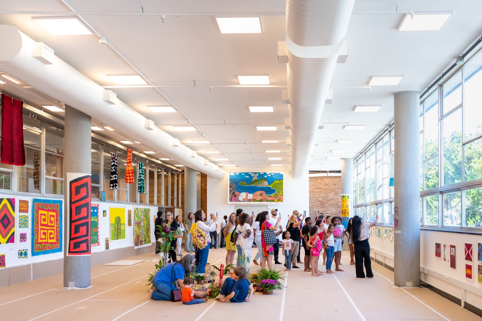 As part of the Living School House artistic residency, the Ways of Knowing group held a day of activities with 30 children from Vila Kennedy, in the west of Rio de Janeiro, at the Museum of Modern Art in Rio (MAM). In addition to visiting the exhibition of work produced during the residency, which brought together 10 indigenous artists from the Living Schools, the children listened to stories about Guanabara Bay from the worldview of the Rio Negro peoples and participated in a canvas painting workshop.