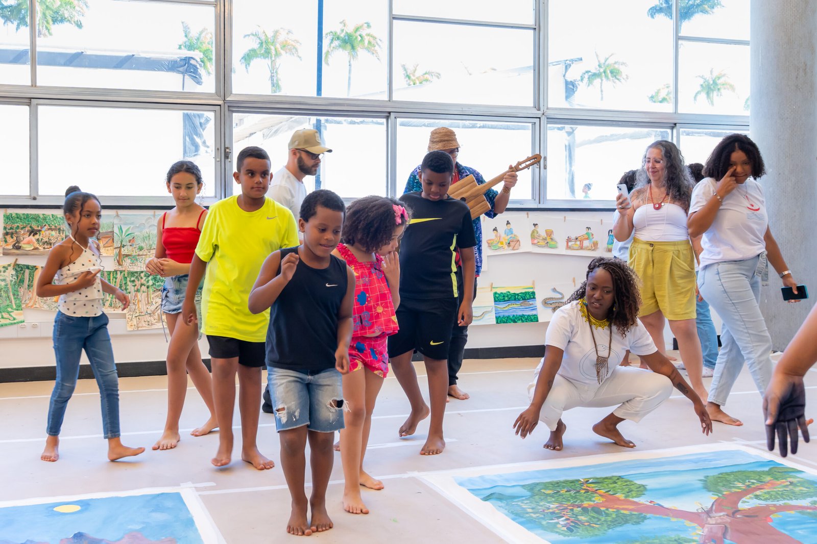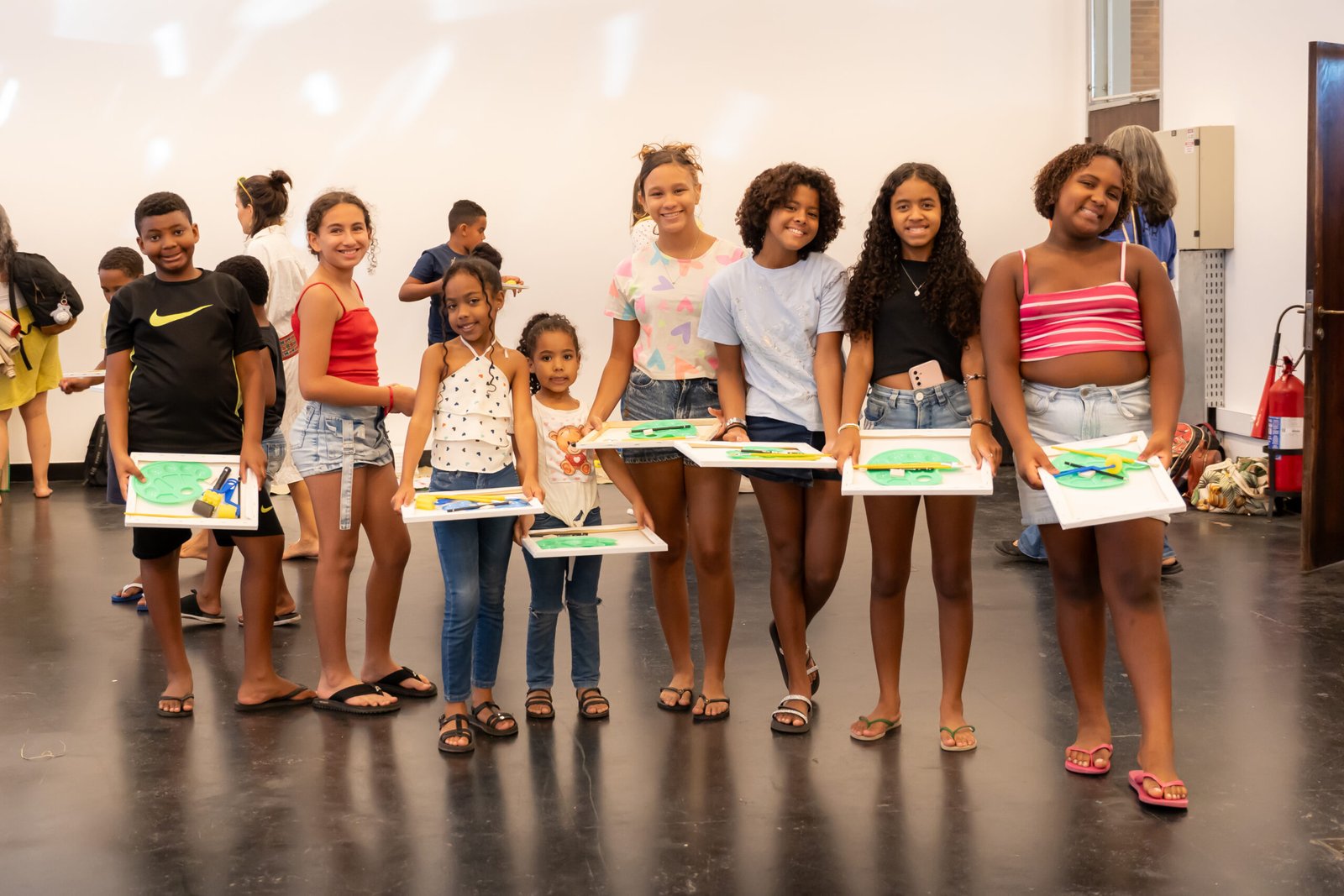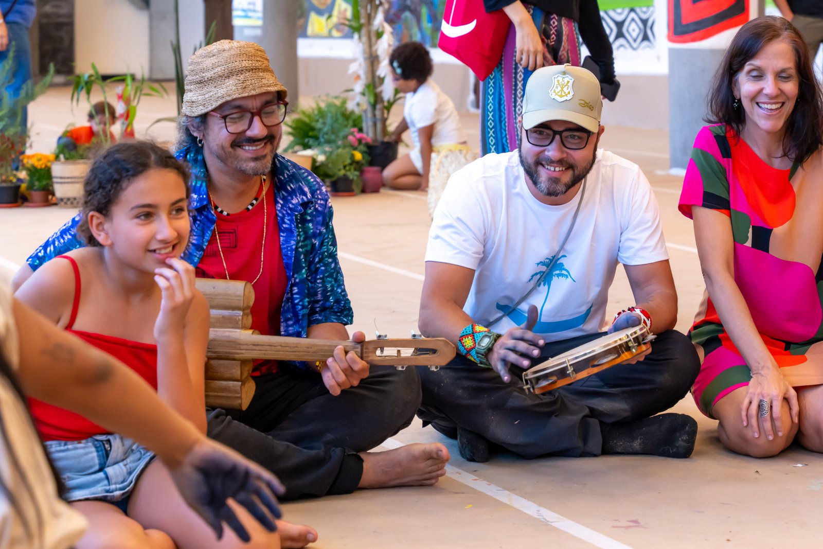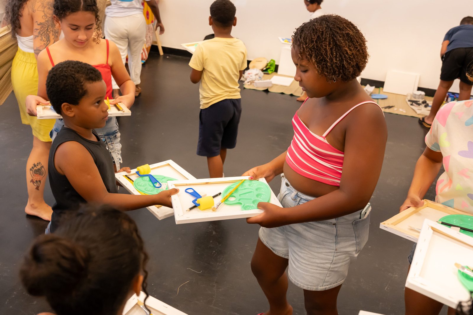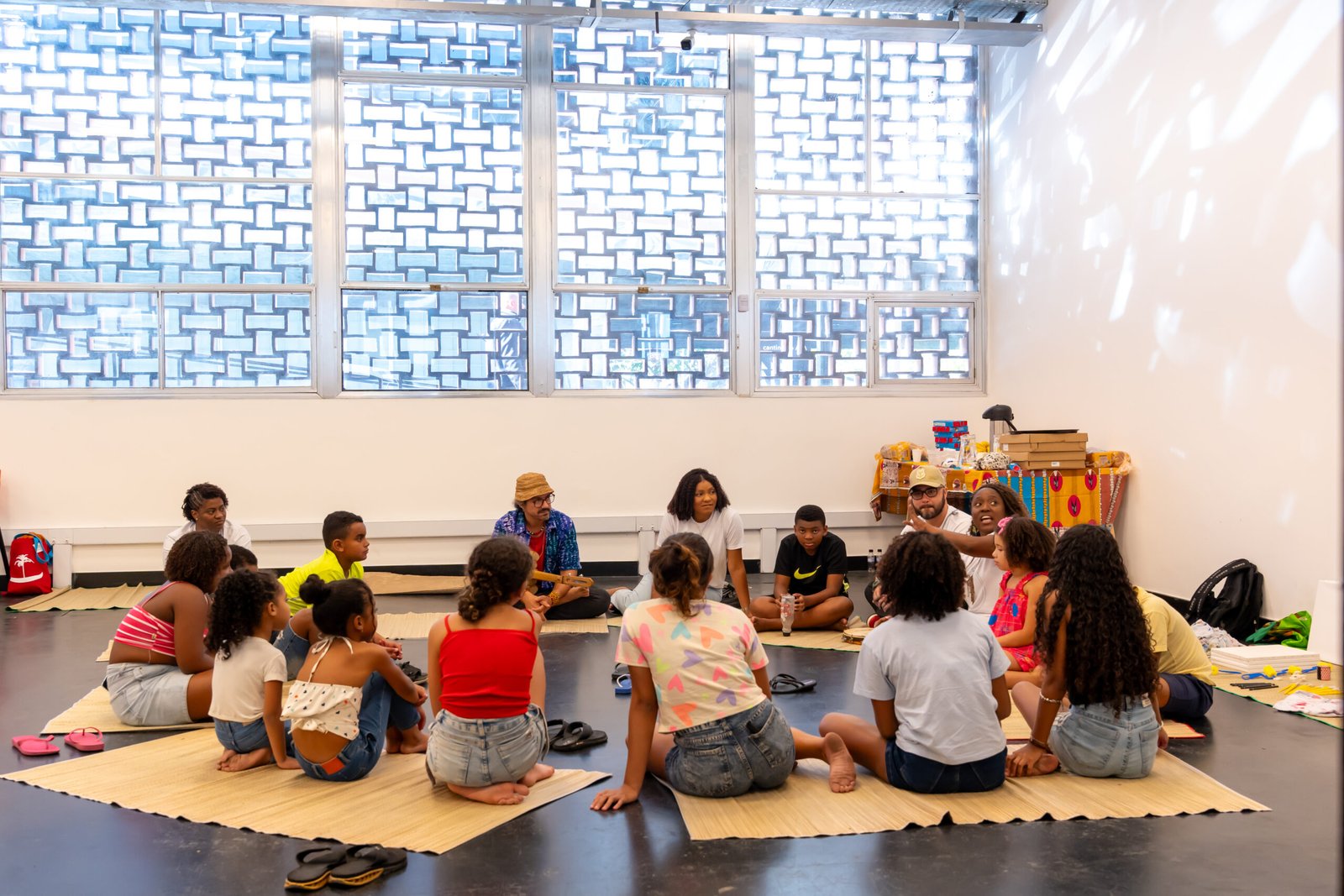 As part of the Living School House artistic residency, the Ways of Knowing group held a day of activities with 30 children from Vila Kennedy, in the west of Rio de Janeiro, at the Museum of Modern Art in Rio (MAM). In addition to visiting the exhibition of work produced during the residency, which brought together 10 indigenous artists from the Living Schools, the children listened to stories about Guanabara Bay from the worldview of the Rio Negro peoples and participated in a canvas painting workshop.