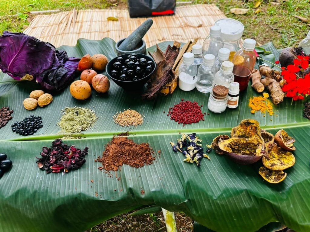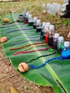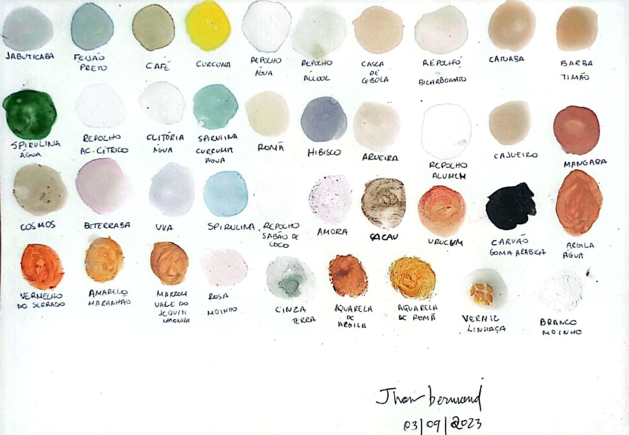 ‘Alquimia das tintas naturais’ é uma vivência estruturada e orientada por Jhon Bermond andm que ele compartilha com artistas, professores, educadores e pais conhecimentos de técnicas originais de pigmentação, passando pela história das tintas naturais, reconexão com os elementos, observação, coleta, preparação, extração e aplicação do pigmento.