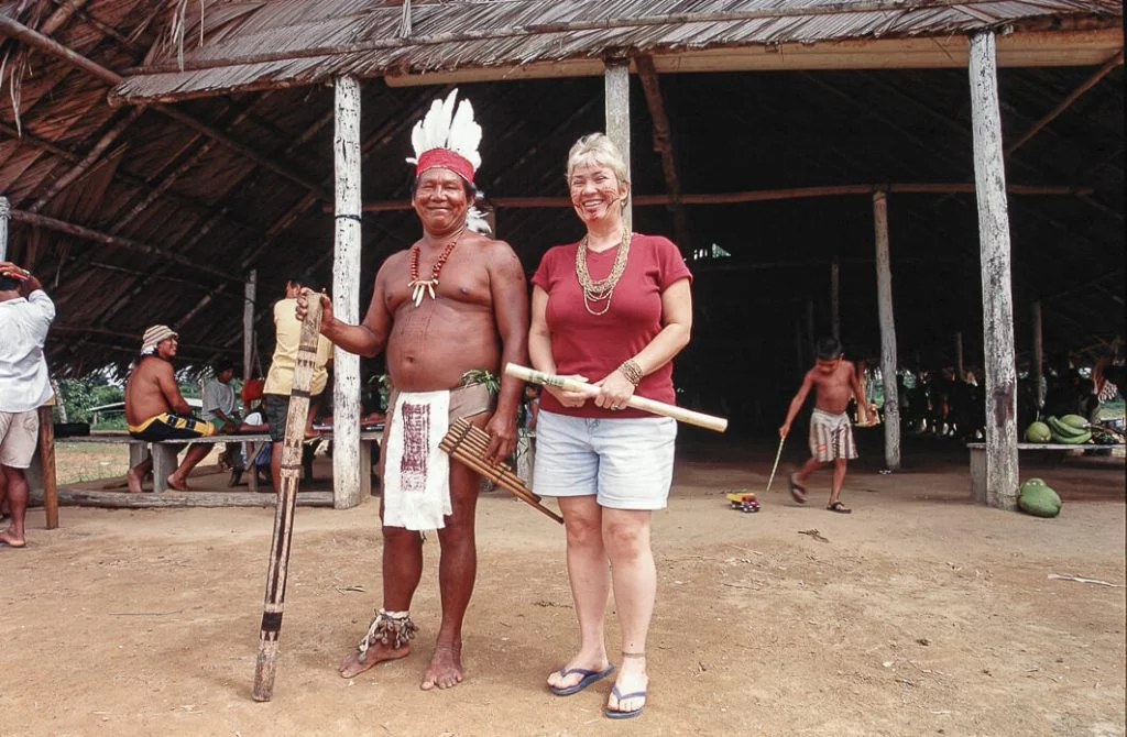 AP: Tá vendo? A gente foi para a Noruega no verão, época em que o Sol brilha o tempo todo; são 24 horas de Sol. Eu fui com o povo Nambiquara, do Mato Grosso, e eles foram fazer uma apresentação. Foi lindíssima e já era de madrugada, eu estava sozinha e chegou um cara e sentou ao meu lado. Ele estava muito bêbado e começou a falar comigo, não parava de falar… Com gestos eu demonstrei que não estava entendendo, aí falei pra ele, em inglês, que eu não falava sami. Aí ele me respondeu muito bravo, em inglês: “Como você renega a sua língua?”. E eu falei: “Mas não é a minha língua”. Aí eu fui socorrida quando chegou um outro e falou para ele que eu não era Sami. Então eu falei: “Nossa, já estou sendo confundida com Sami” e os Nambiquara falaram assim: “Não sai de perto da gente, por favor, não sai de perto. Porque você sai e aí é tudo igual! Vocês brancos são tudo igual, e a gente não te reconhece.”.