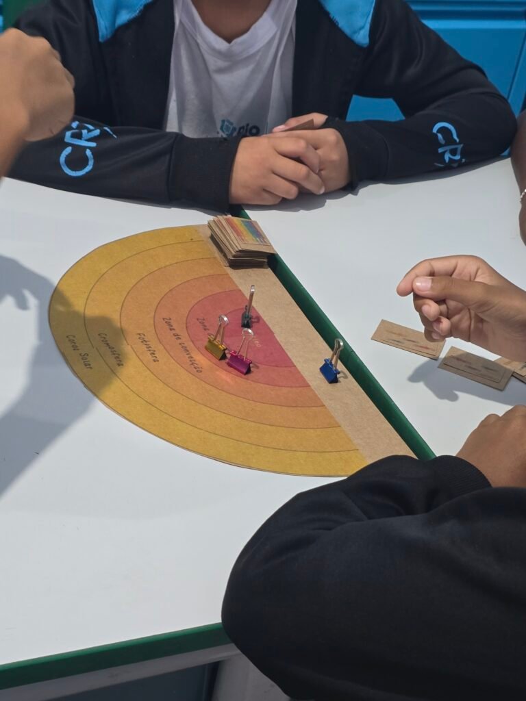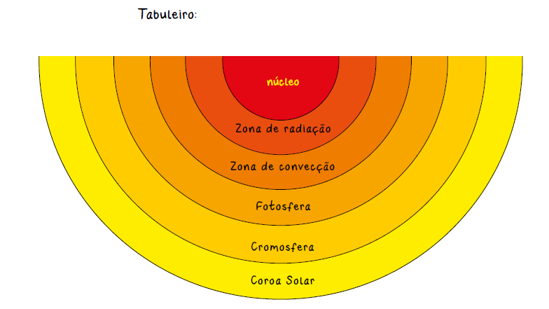 Ao longo do caminho, cartas de transformação e de eventos solares interferem na travessia: às vezes a luz avança, outras vezes a gravidade a puxa para trás, e até mesmo uma instabilidade de energia pode mudar o rumo do jogo. Assim, entre avanços e recuos, as crianças experimentam com o corpo e com a imaginação os processos físicos e químicos que acontecem dentro do Sol.