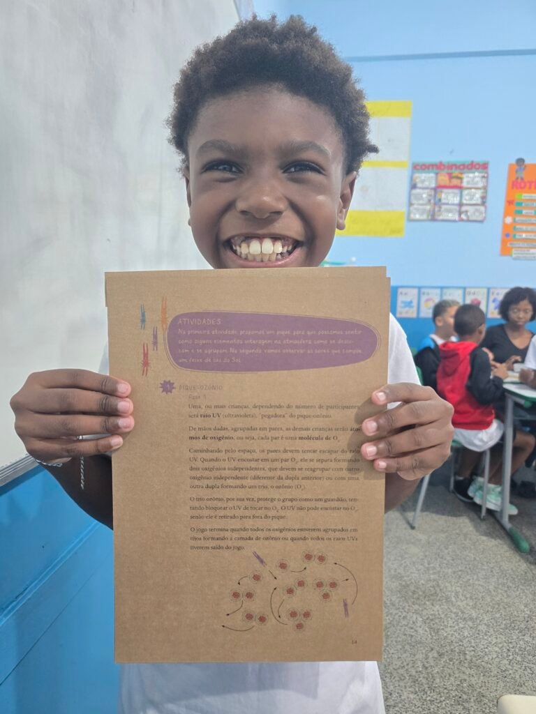 Depois, foi o momento do Pique Ozônio, uma brincadeira de correr, juntar e separar que é capaz de transformar qualquer espaço em uma pequena atmosfera em movimento. As crianças assumem papéis em duplas de oxigênio — a forma mais comum desse elemento na natureza —, outras se juntam em trios para representar o ozônio, enquanto uma delas encarna o veloz raio ultravioleta.